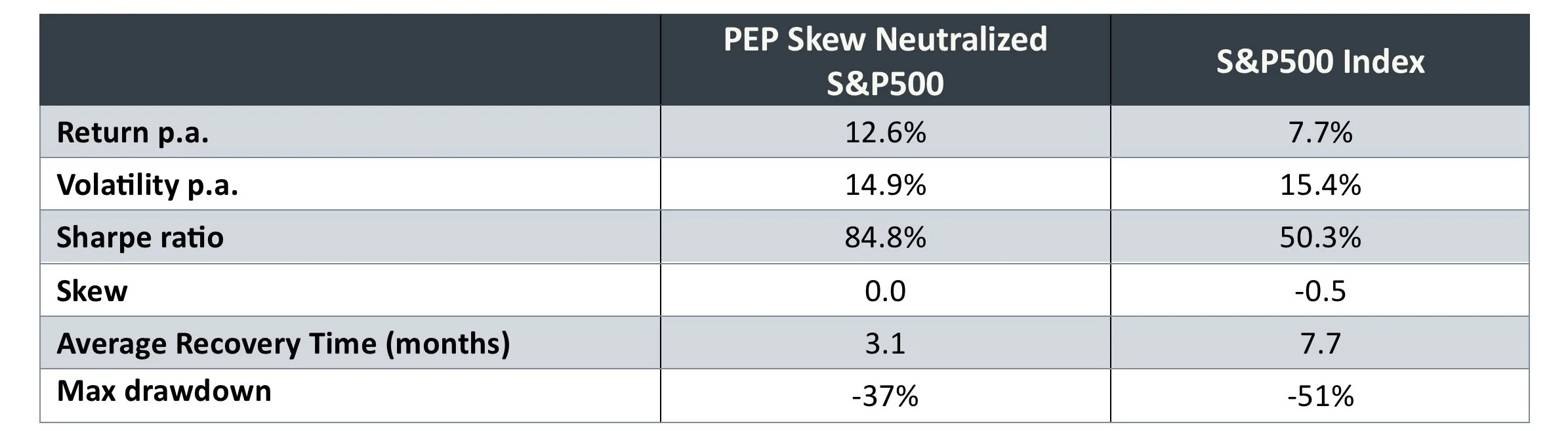 Source: PEP, Bloomberg. Skew neutralized S&P500 is based on the output of PEP proprietary models. Returns in USD. All performance taken from 01/01/2000 to 05/31/2024. Past and simulated performance is no indication of future results.