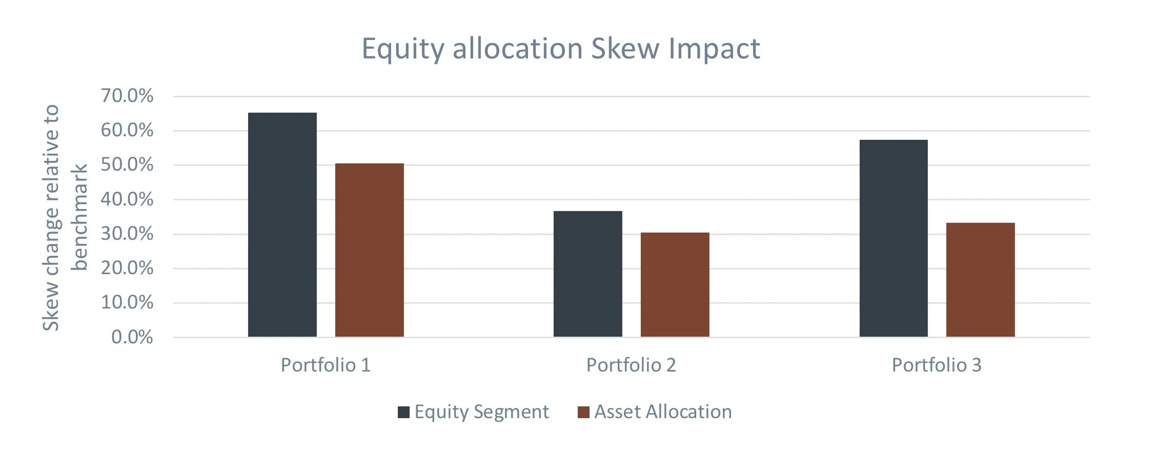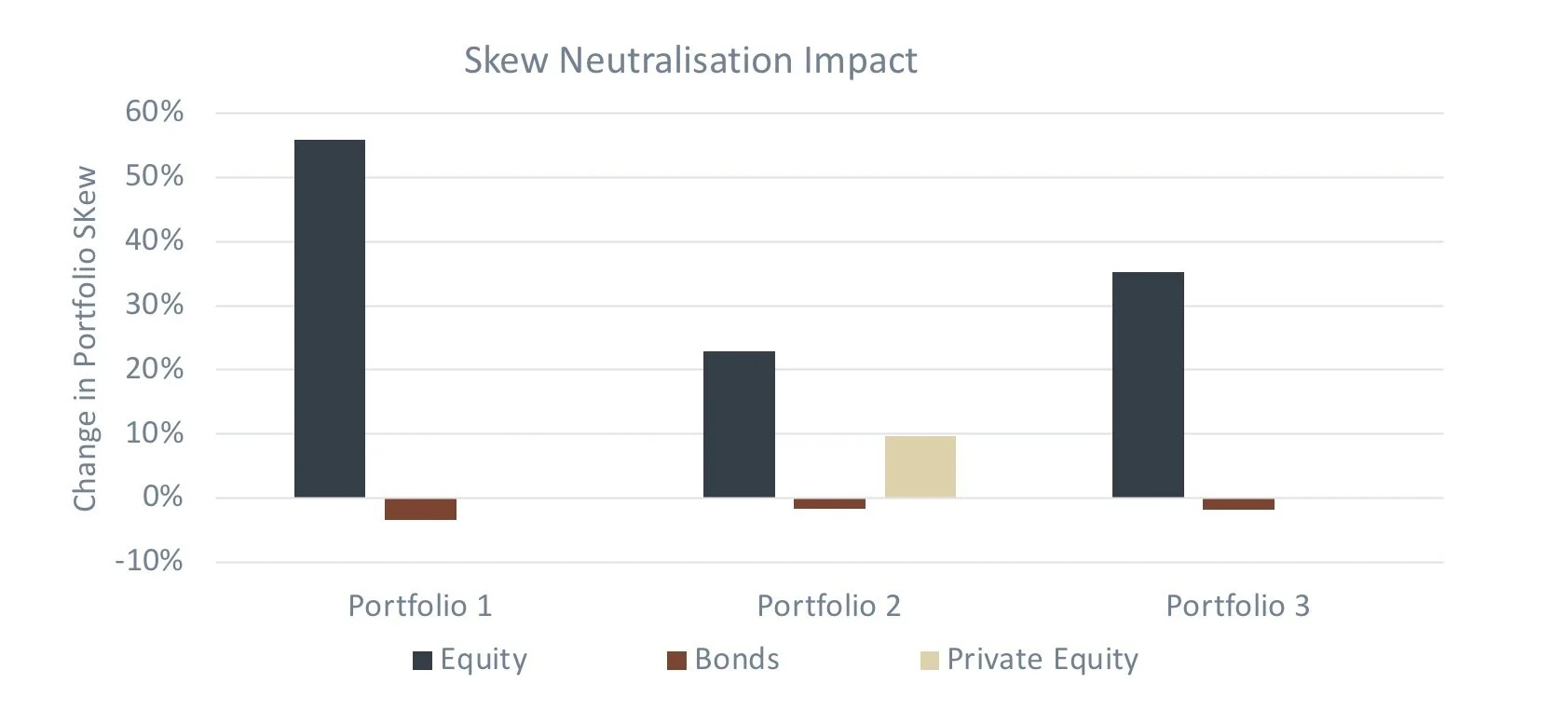 The chart below shows the impact of neutralizing the skew on three asset types separately – public equity, private equity, and credit. So for example, if we neutralize the skew of the equity allocation in Portfolio 1, it improves the overall skew of Portfolio 1 by around 55%.