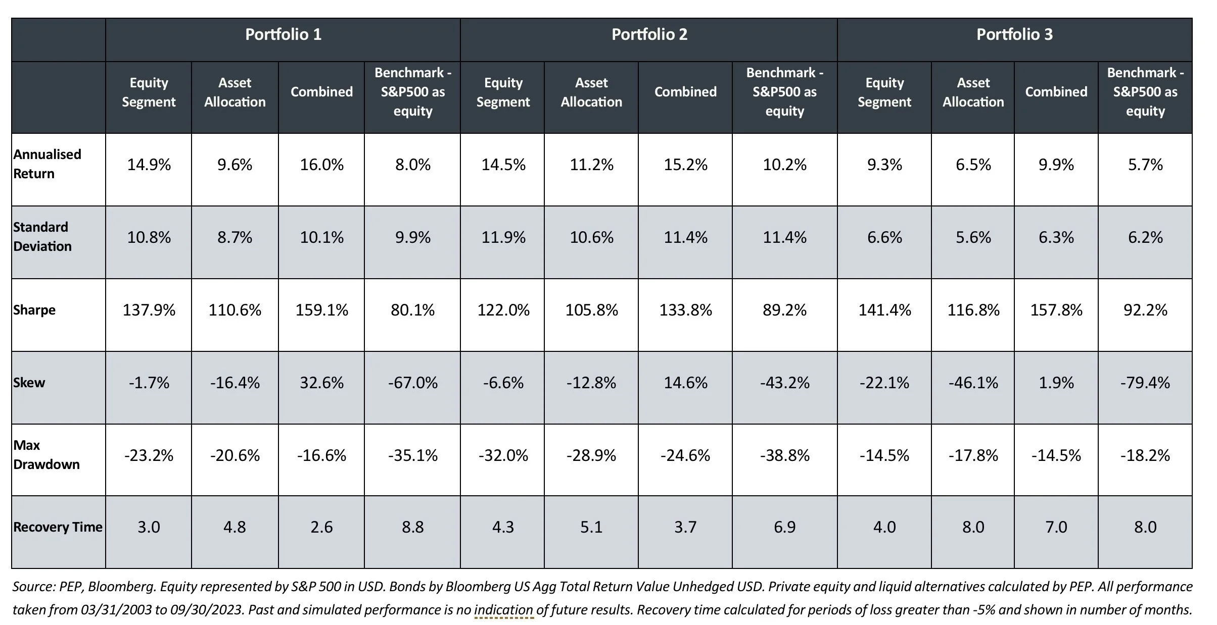 Source: PEP, Bloomberg. Equity represented by a combination of the S&P 500 in USD and PEP’ proprietary equity portfolios in USD. Bonds by Bloomberg US Agg Total Return Value Unhedged USD. Private equity and liquid alternatives calculated by PEP. All performance taken from 03/31/2003 to 09/30/2023. Past and simulated performance is no indication of future results.