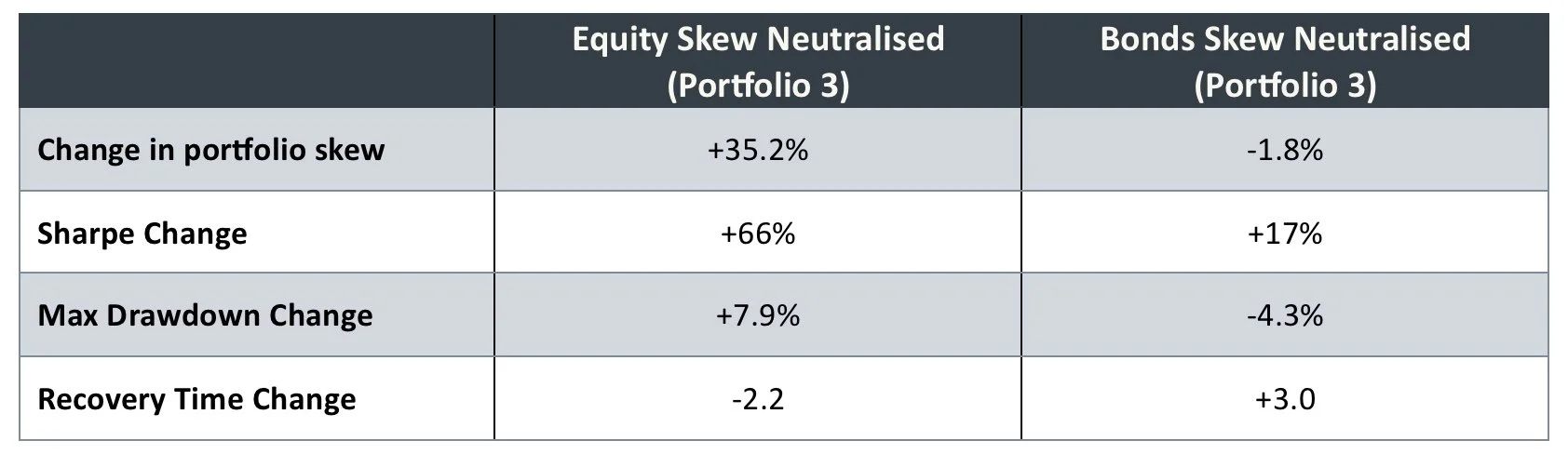 So, after addressing the skew problem via equity, do we get all the expected benefits of the neutralized skew at an overall portfolio level? The below table shows how even in the portfolio least heavily weighted to equities (Portfolio 3 with 35% Equity, 65% bonds), we still get outsized improvement from only focusing on the skew in public equity allocation.