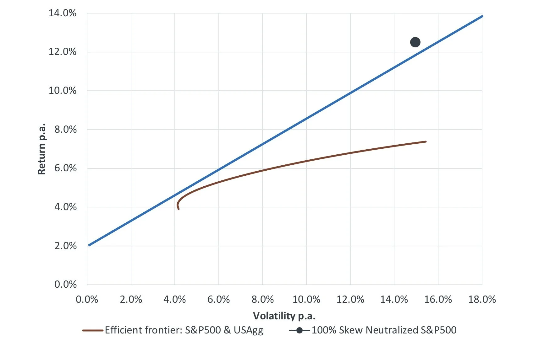 The skew neutralized S&P500 portfolio from above is represented by the dot. The fact that this sits comfortably above the tangent does support the argument that neutralizing the skew on equity markets is more efficient than the most efficient static portfolio of equities and bonds.