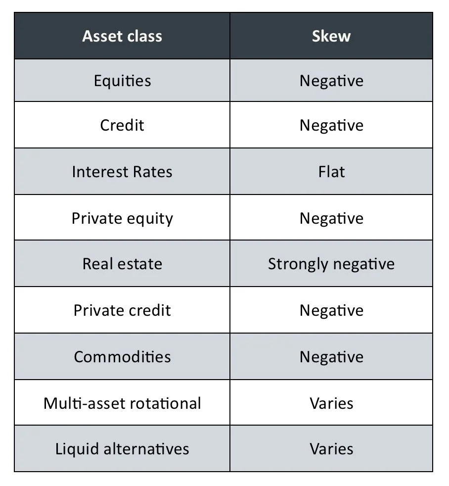 · The greatest source of negative skew within most portfolios is public equities. Addressing the negative skew problem is therefore best achieved through focusing on this class.