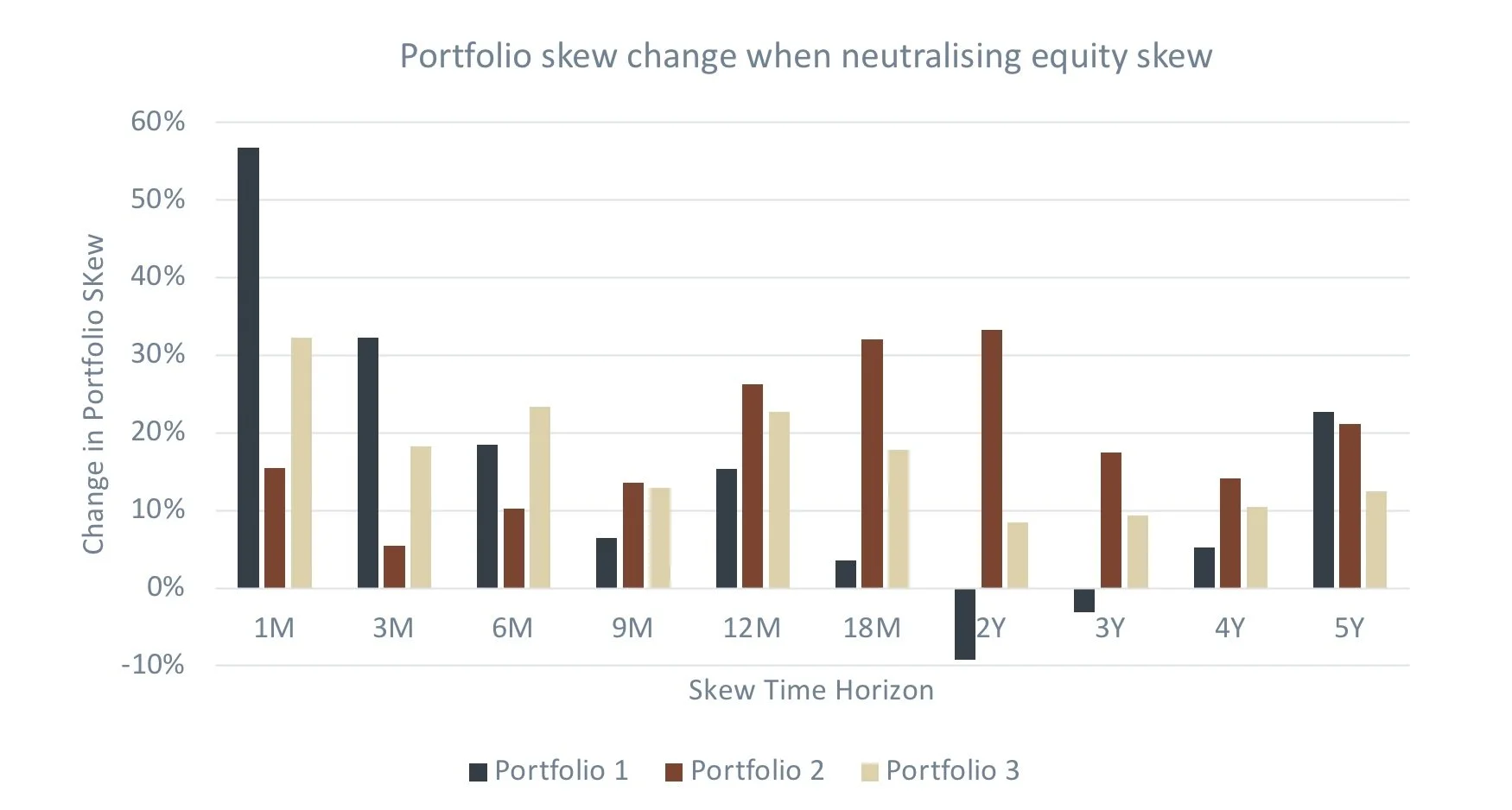 As can be seen, the benefit of neutralizing the equity skew is greatest in all strategies, even in Portfolio 3 where the equity allocation is relatively low. Neutralizing equity skew also has a significant effect across all horizons. The following chart shows the effect of neutralizing the skew of the equity portfolio for all 3 portfolios, over multiple time horizons.